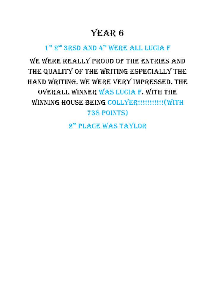 Finally, in year 6 we had 12 entries Lottie being first, Freya being second, Bella  being third and James  being fourth.