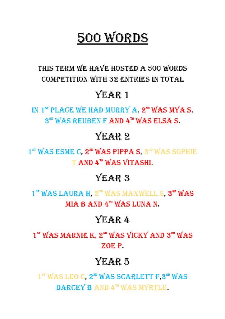 In the first half of the Spring Term we held a '500 Words' writing competition.  The best entries won points for their house.