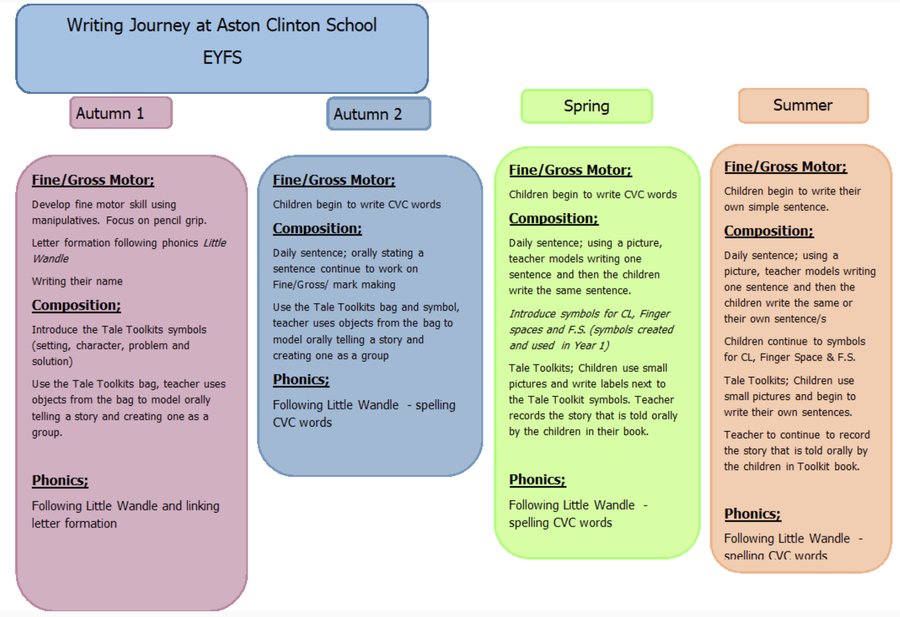 At Aston Clinton, we ensure that all children see themselves as a writer and have successful writing experiences. Our aims are for the children to be able to express themselves clearly and fluently in order that they can take advantage of opportunities in future education and employment.  Children will be able to control their use of language and write for a range of purposes.
